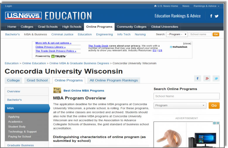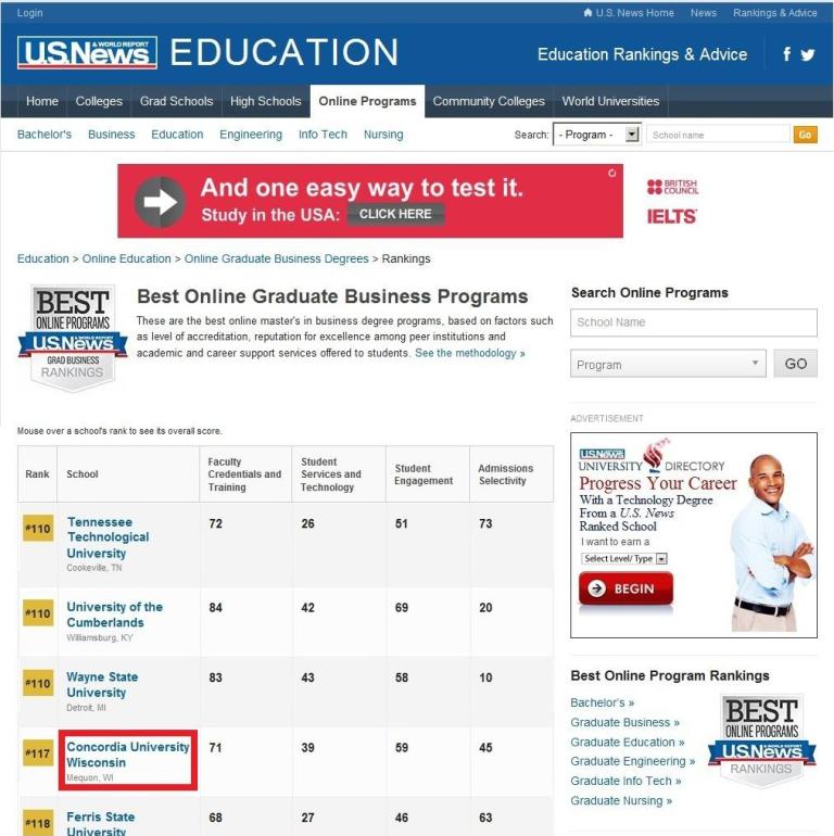 美國威斯康星協和大學 2017年全美遠程商學院排141名 USNews- Graduate Business Programs 2015